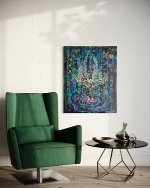 This unique piece of art is for introspection, self discovery, maybe transformation. With the colour black, purple, vibrant turquoise, gold and silver, you feel a balance between the darkness and the lightness.