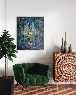 This unique spiritual and energetic painting, 100cmx80cm, is a vision that I had once. There are doors to other worlds, through perle curtains and dragonflies. A luminous angel appears. I saw lights in the universe, circularity. A another door, larger than the other is inviting us somewhere.