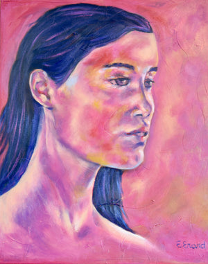 This original oil painting "Desire", 40cmx50cm, is a portrait of a sensual woman who is about to kiss someone with her eyes plenty of desire. This unique artwork, inspired by an old movie "l'Amant",  has shades of pink and purple and gives a sensual touch to your room.