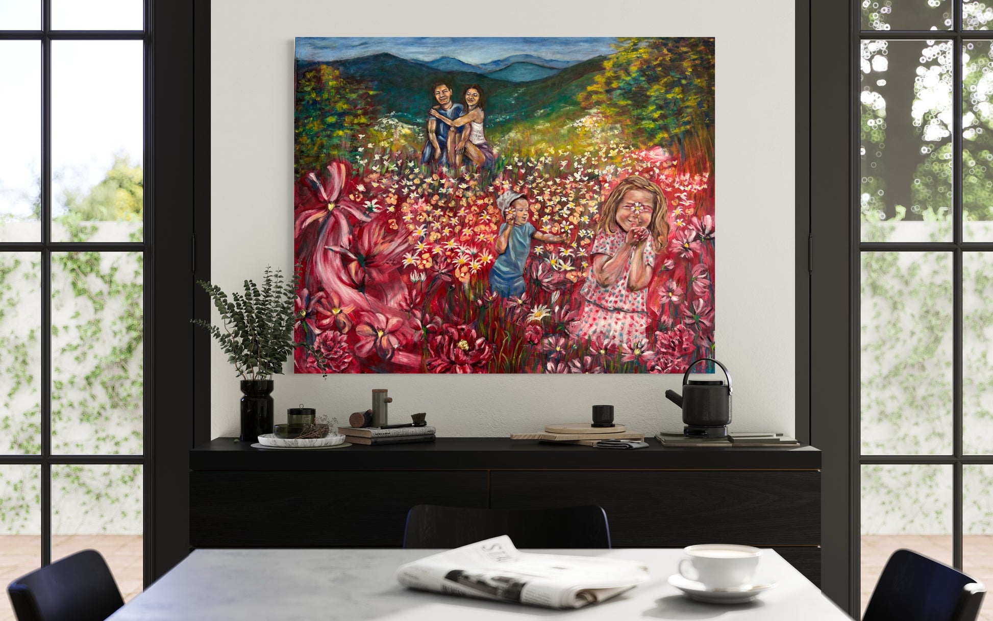 As a mother of two wonderful and lively children, I express on this painting all the love and the joy when I look at my children and it uplifts my mood for the entire day. This is then for me a cheerful, uplifting, smile-inducing oil painting where you can feel all the love, energy, joy and dynamics of a family. And what else as a colorful flower field to embrace this entire joy and love!