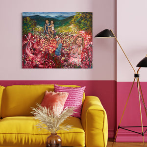 Family Flowers oil painting, 80cmx100cm, is a family portrait in a flower field, to feel lots of joy, love and nature. A dynamic and lively art piece with all colours of the rainbow, embracing positivity, that boosts your mood for the entire day.