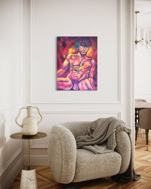 "Le regard sensuel" is an original oil painting, 80cmx60cm, a nude portrait of a sensual man. This art piece with colours of the sunset gives a sensual, romantic and warm touch in your room and awake desire.