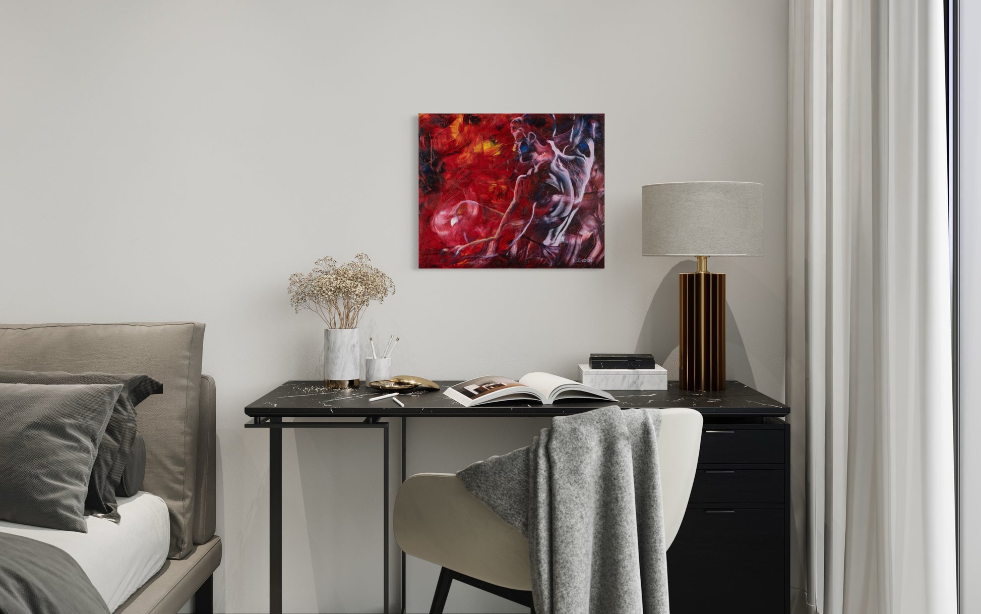 "Man and Fire"  original oil painting, 50cmx60cm, is an abstract realist representation of a man's back, a sensual man, dancing with the force of fire. Feel warmth and sensuality with this beautiful red artwork and awake your inner fire and strength.