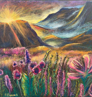 This beautiful original little painting, 30x30cm, is a sunset over mountains and a flower field, that gives you a warm, mystical and dreamy feeling. This artwork has expressive marks of oil pastels and gentle brushstrokes of oil paint as well as a juicy cocktail of vibrant colours.