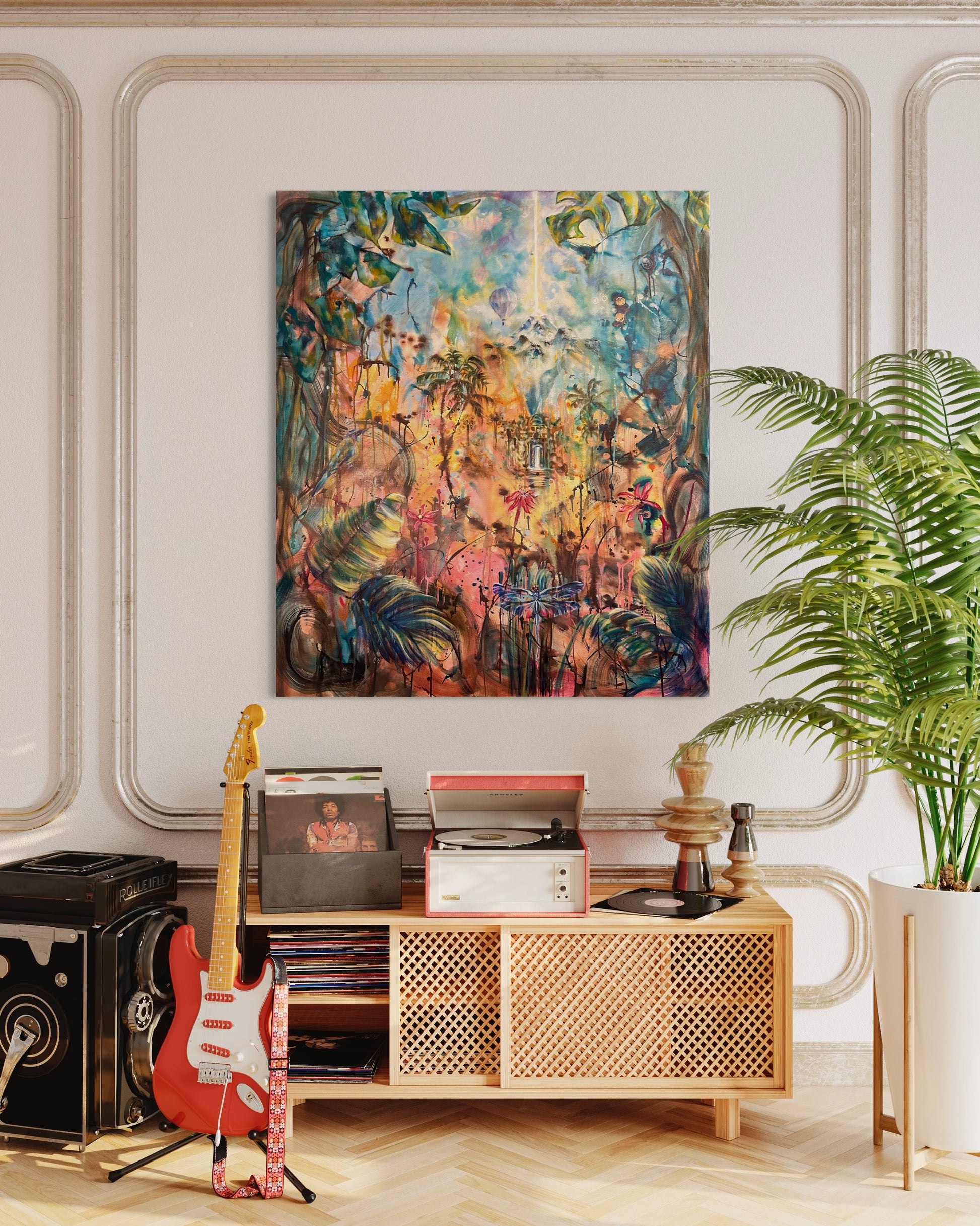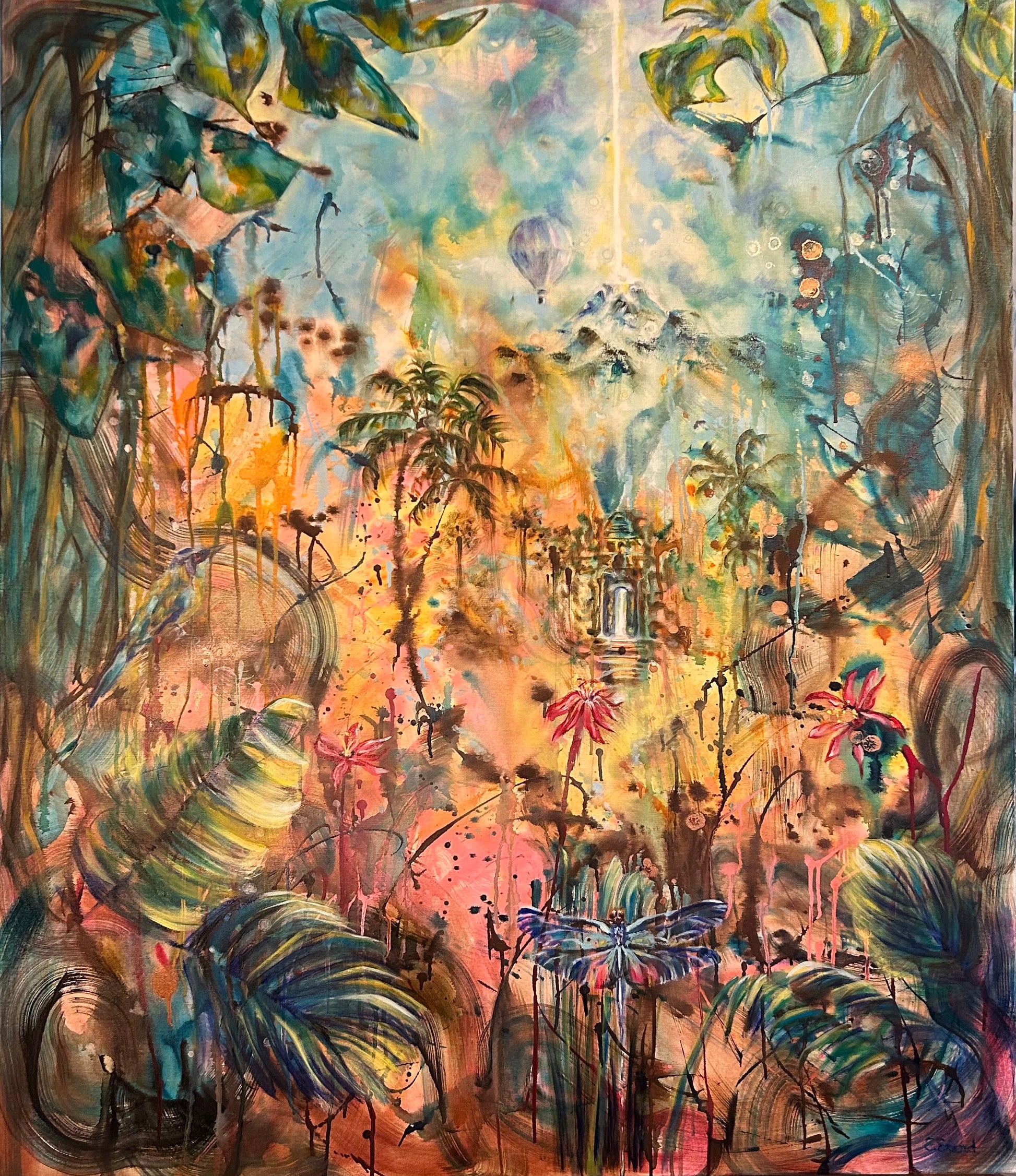 This unique piece of art embrace the bright colours and the wilderness of the tropical forest. The dragonfly, the temple, the balloon and the light in the sky open your imagination and spirituality.