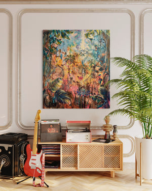 The Unknown original painting, 140cm x 120cm, is an immersion into the wild nature and is leading you into another parallel world, where your heart is your guide. You just feel attracted to it, your inner fire burns brightly, you don't to understand everything, you just want to follow the flow and your intuition.