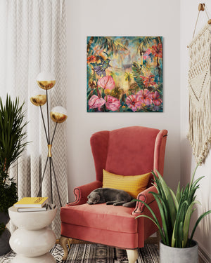 This unique original oil and mixed media painting, 80cm x 80cm, is for the tropics and exotic lovers, who like to escape in a world, where the nature gives a lively and peaceful feeling at the same time. The vibrant colours green, pink, orange and yellow are full of energy. The dark green and brown colours make you feel grounded.
